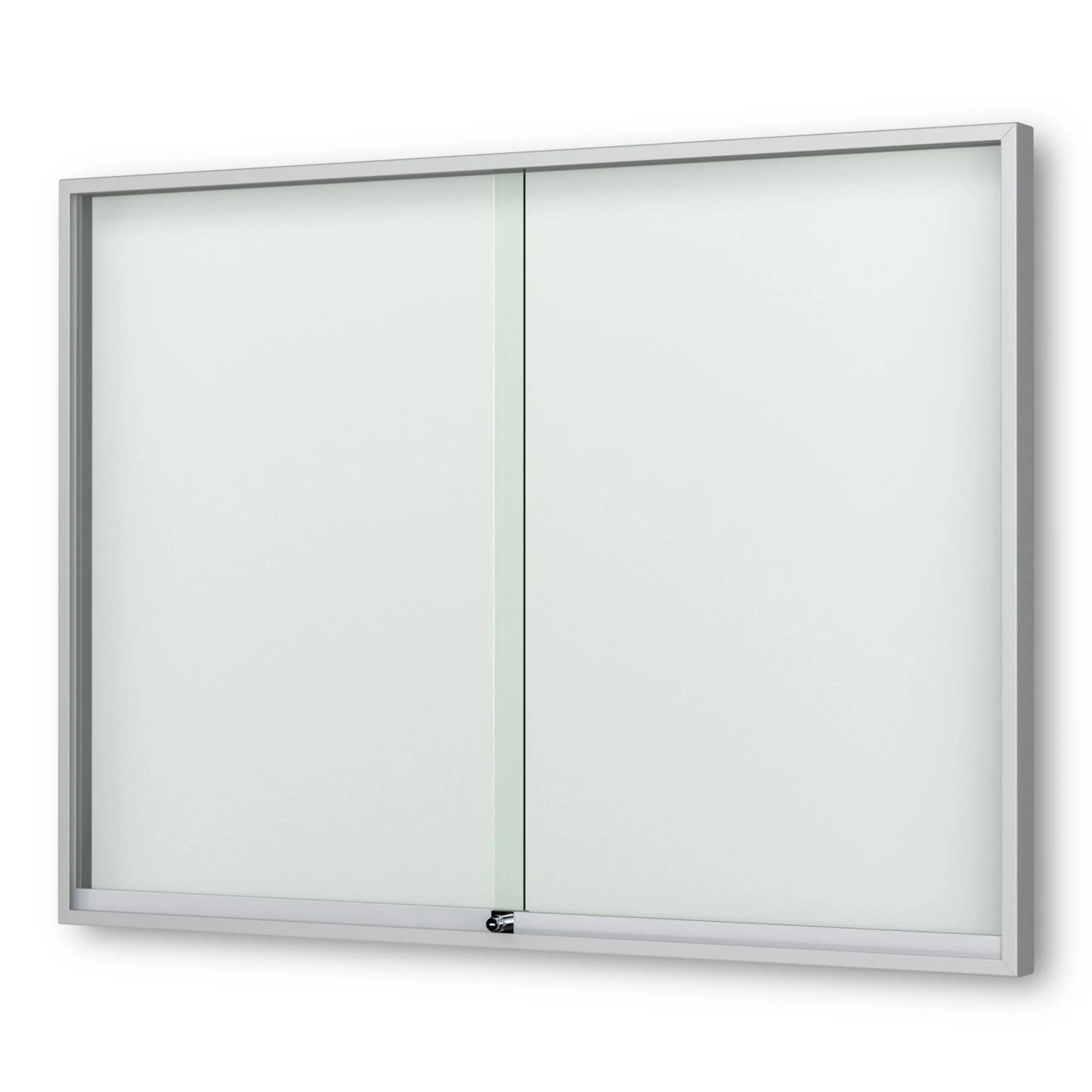 Schaukasten Fortis - eckig - mit Schiebetüren - 60 mm Gehäusetiefe, rollengelagerte Schiebetüren, höchster Brandschutz (A1) Größe - 8 × DIN A4 • 930 × 695 mm Öffnung - rollengelagerte SchiebetürenVerglasung - Einscheiben-Sicherheitsglas / ESGOberfläche - Eloxierung in matt-silber (E6/EV1)Beleuchtung - ohne BeleuchtungSchließung - Sicherheitsschlösser mit je 2 SchlüsselnRückwand - weiße, magnethaftende Rückwand inkl. 10 Magnete