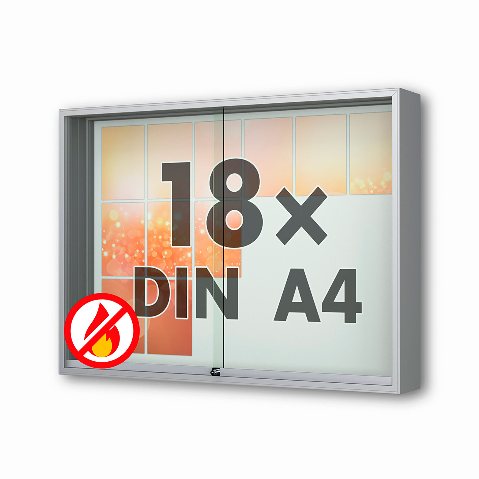 Schaukasten Fortis - eckig - mit Schiebetüren -210 mm Gehäusetiefe, rollengelagerte Schiebetüren, höchster Brandschutz (A1) Größe - 18 × DIN A4 • 1370 × 1010 mmSichtfläche: 1330 x 950 mm Öffnung - rollengelagerte SchiebetürenVerglasung - Einscheiben-Sicherheitsglas / ESGOberfläche - Eloxierung in matt-silber (E6/EV1)Beleuchtung - ohne BeleuchtungSchließung - Sicherheitsschlösser mit je 2 SchlüsselnRückwand - weiße, magnethaftende Rückwand inkl. 10 Magnete