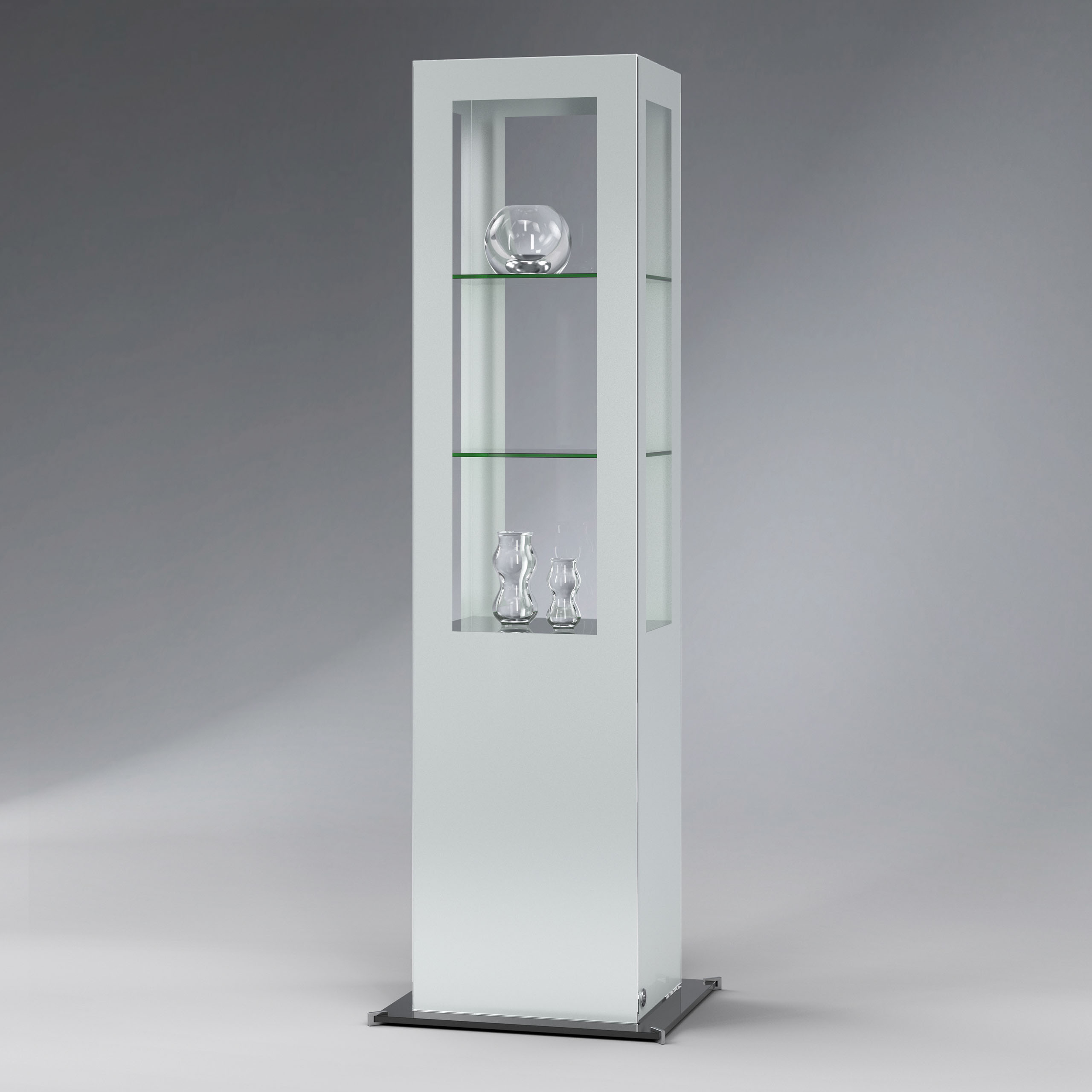 - Design-Säulenvitrine in Ganzglas-Bauweise mit farbig hinterdruckten Glasflächen